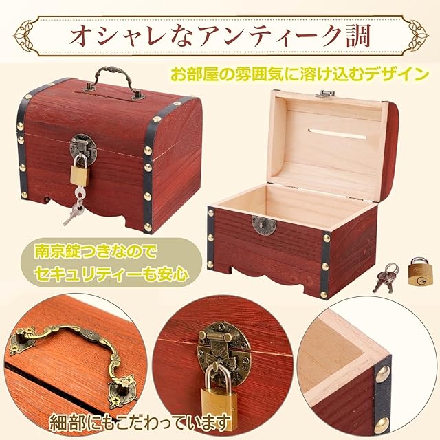✨アンティーク好きにぴったりの木製宝箱</br> レトロな小物やアンティーク風のデザインが好きな方にぴったりの、木製で作られた宝箱型貯金箱です。温かみのある質感とクラシカルな雰囲気が、インテリアに特別なアクセントを加えます。毎日眺めたくなるようなおしゃれな一品です。</br> 鍵付きで安心、実用性も抜群</br> 南京錠と鍵が付属しており、貯金箱として大切な中身をしっかり守ります。小銭やお札をたっぷり収納できる深さがあり、上部の投入口はお札を折らずに入れられるサイズもご用意(Mサイズ以上)。実用性と安心感を兼ね備えたデザインです。</br> 贈り物やイベント用にもおすすめ</br> 宝箱を開けるときのワクワク感は、大人も子どもも楽しめます。お子様への誕生日プレゼントや、パーティーや謎解きゲームの小道具としても大活躍。特別なシーンを盛り上げるユニークなアイテムとして人気です。 インテリアとしても映えるデザイン</br> カラーはブラウンとホワイトの2種類、サイズもS・M・L・XLから選べるので、使い方やお部屋の雰囲気に合わせてお選びいただけます。どんな空間にも馴染む木製のデザインは、インテリアとして置くだけでおしゃれな存在感を放ちます。</br> ✨ 暮らしに彩りを添える特別なアイテム</br> レトロな宝箱型のデザインは、収納アイテムでありながらインテリアの一部にもなる優れもの。毎日の貯金が楽しくなるだけでなく、使うたびにちょっと特別な気分になれるアイテムです。あなたの暮らしにワクワクする楽しいアクセントをどうぞ。</br> 本体仕様】Mサイズ:幅17.5㎝ 奥行13㎝ 高さ12.5㎝ 上部投入口8.5㎝ 宝箱Mサイズ×1 南京錠1つと鍵2つが付属します。