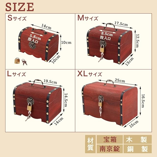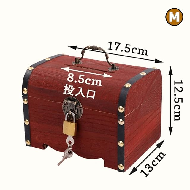 【本体仕様】Mサイズ:幅17.5㎝ 奥行13㎝ 高さ12.5㎝ 上部投入口8.5㎝ 宝箱Mサイズ×1 南京錠1つと鍵2つが付属します。
