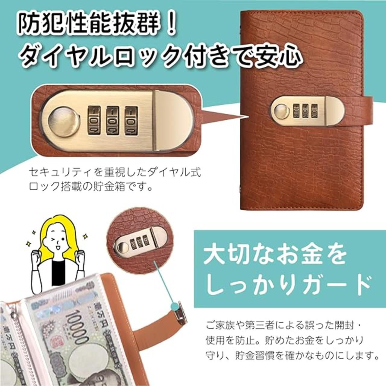【大容量ダイヤルロック付き貯金手帳】 50ページ構成で、1ページに1万円札を2枚収納でき、最大100枚(計100万円)まで貯金可能な大容量手帳型貯金箱。封筒式仕切りで紙幣や小物を種類別に管理でき、クレジットカードや免許証などの貴重品も整理整頓できます。防犯性に優れたダイヤル式ロックを搭載し、大切なお金やカードをしっかりガード。家族や第三者による誤使用を防ぎ、貯金習慣の継続をサポートします。透明ポケット仕様で貯金額がひと目で確認でき、封筒貯金のように使えるのも便利。耐久性が高く、防災・災害時の備えや日常の防犯にも最適。鍵付きで子供や他人からの誤使用を防ぎ、安全に資産を保管できる、安心と実用性を兼ね備えた貯金管理アイテムです。