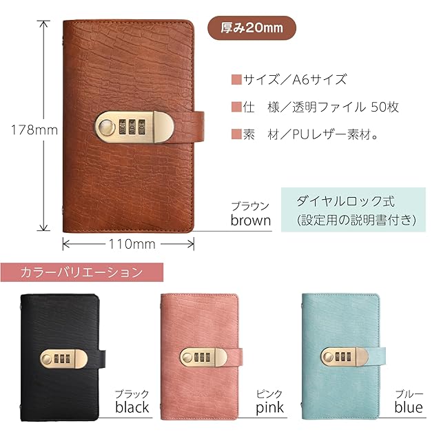 【サイズ:仕様】A6サイズ幅11×高さ17.8×厚み2cm。透明ファイル50枚。ダイヤルロック式(設定用の説明書付き)PUレザー素材。