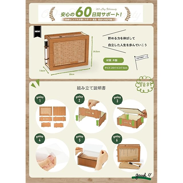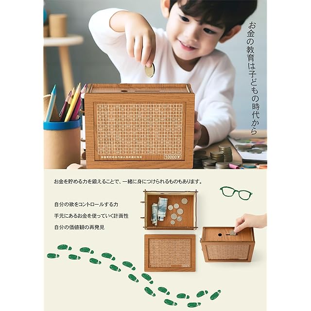 Qmitto 貯金箱 いくら貯まった見える、金額を自分で決める! 書き込み式貯金箱 卓上 お札 小銭 木製 お小遣い 小学生プレゼント クリスマス