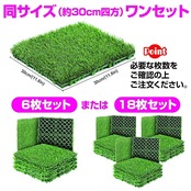 同じサイズ(約30cm四方)の人工芝を6枚セット、もしくは18枚セットでお届けいたします。必要な枚数をご確認の上ご注文ください。