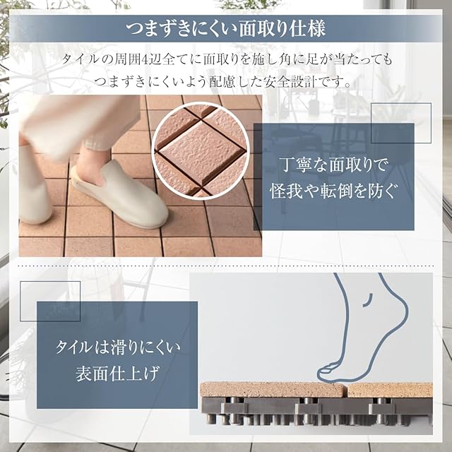 【15mmの足高構造】タイルの足裏は15mmと高めに設計されているため、雨水や水道水がスムーズに流れていきタイル上に水が溜まらないく水はけの良さがポイント。バーセアの脚は下地を傷めないように丸みのある面取りしています。さらに脚が90本と大量にあることで荷重を分散させて負担軽減に繋がります。タイルの各辺も面取りしていることで、角に脚が当たっても躓きにくいよう配慮しました。