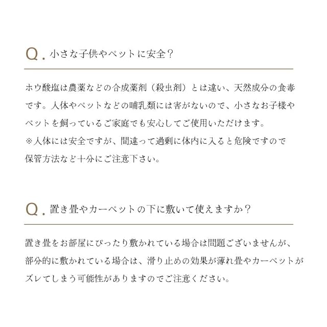 ホウ酸塩で優れた防カビ・防虫効果! 人に害のない天然成分で、だれでも手軽にご使用できます。 シートにホウ酸塩をしみ込ませてあり、それが拡散・浸透することで ダニや昆虫類を駆除することができます。 菌類・藻類・バクテリア・ゴキブリ・甲虫・アリ・ノミなど ホウ酸塩の毒性は「食塩」とほぼ同じ。 私たちの体内に入っても肝臓機能で体外に排出されますが、 ダニや昆虫などの体内にはこの機能がないため 一定以上のホウ素が体内に入ると死に至ります。 ホウ酸塩には殺菌効果もあり、防カビ効果も期待できます! 【畳の下敷き】【押入れや家具の防虫対策】【ジョイントマットの下敷き】 【ウッドフロアの下敷き】【クッションフロアの下敷き】 【 効果は半永久・無味無臭 】 ・長期間効果が持続します。本製品に裏表はございません。 ・本製品にシックハウス症候群を引き起こす物質は含まれておりません。 ・シートははさみやカッターで簡単にカットしてお使いいただけます。 【 ご使用上のご注意点 】 ・人体には安全ですが、間違って過剰に体内に入ると危険ですので 小さなお子様やペットの手に届かない場所に保管してください。 ・ホウ酸は水に溶けやすい成分のため、水に濡れないようご注意ください。 ・施工の際はシートで手を切らないようご注意ください。