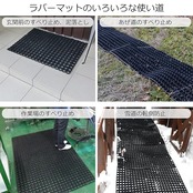 用途例:お家まわりに(玄関まわり、駐車場、お庭の芝生)、通路に(雪道、あぜ道)、作業場に(工場、調理場) 専用ジョイントパーツで手軽にラバーマット同士や見切り材の連結ができます。 専用ペグで地面に固定できます。
