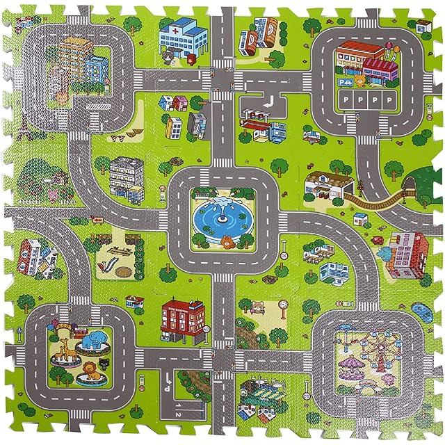 商品名:ユノックス 床材 ジョイントマット パズルマット 道路 9枚セット [約31.5x31.5x厚さ1cm/子供 キッズ プレイマット/防音対策/床の傷防止/床暖房対応]