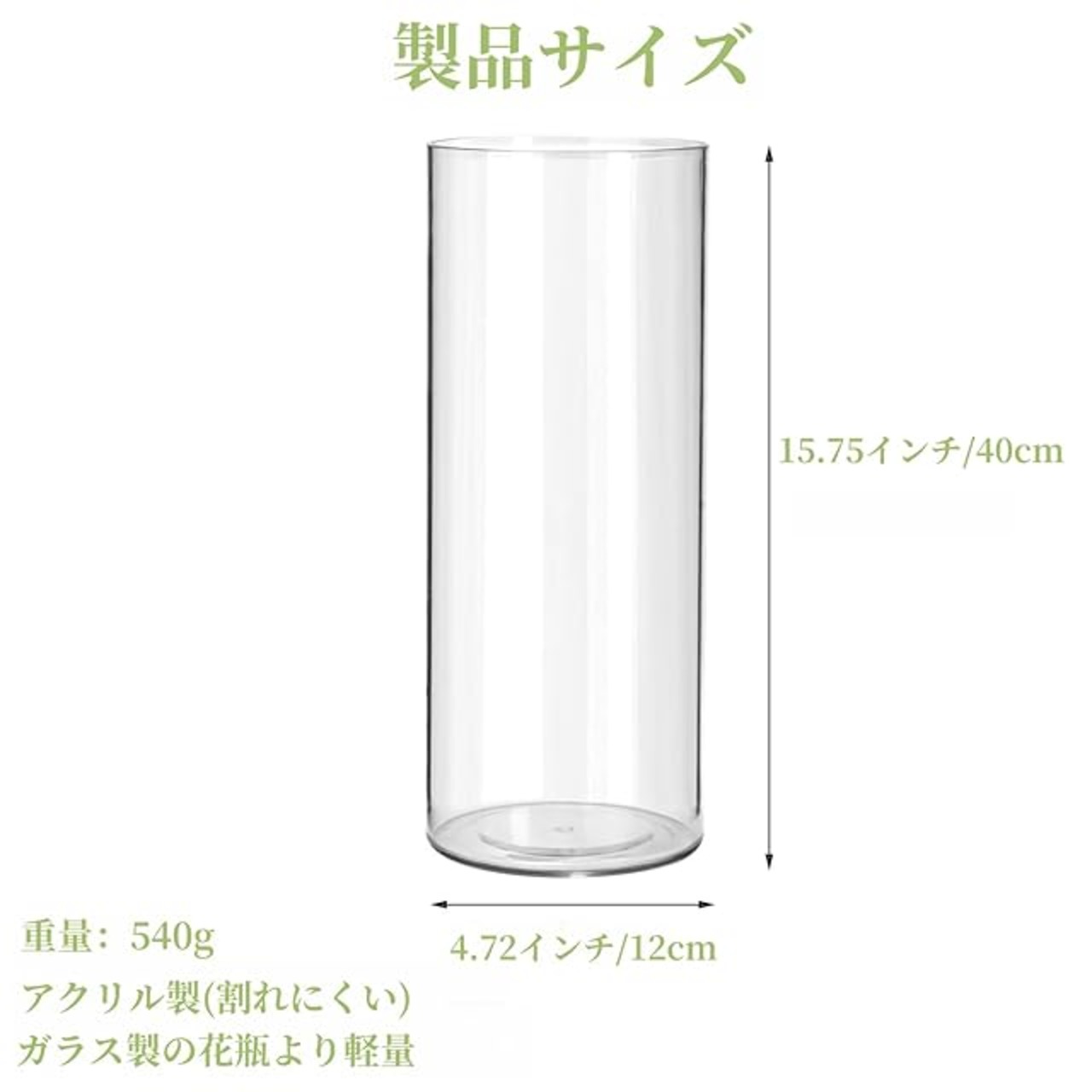 ✨ なぜ選ばれる?<br> → 「軽量(195g)・耐衝撃・洗いやすさ」 で<br> ガラス花瓶の悩み(重い/割れる/手入れ大変)を全て解決!<br> 商品詳細<br> ・素材:高級アクリル(BPAフリー)<br> ・サイズ:大型(40cm×12cm)/スタンダード(30cm×10cm)<br> ・対応:生花・造花・水耕栽培<br>