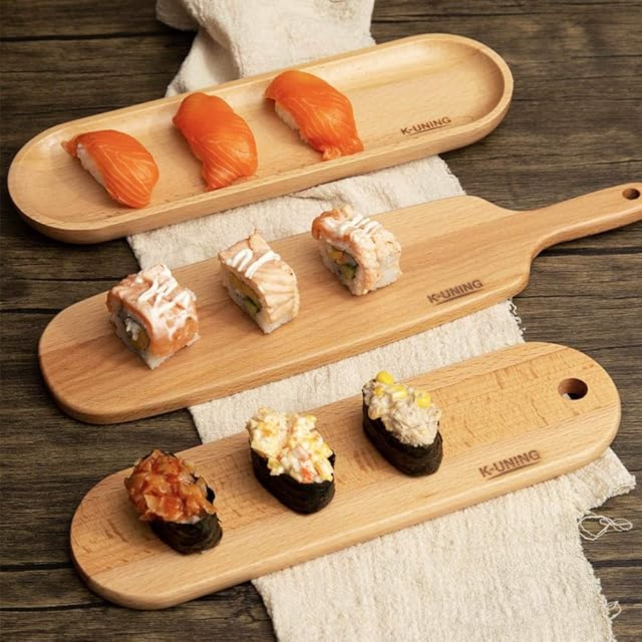 K-UNING木製取っ手付きトレー 巻すし皿 寿司プレート ピクニック アウトドア 軽量 盛りつけ台 キッチン用細長 トレー