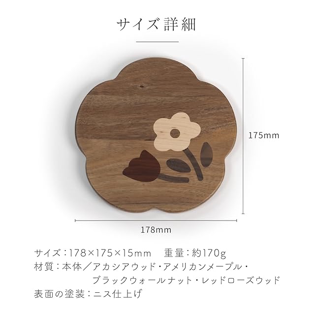 【4種の高級天然木を贅沢に使用】アカシアウッド、アメリカンメープル、ブラックウォールナット、レッドローズウッド──それぞれ異なる質感と色味が調和した、自然美あふれるプレートです。