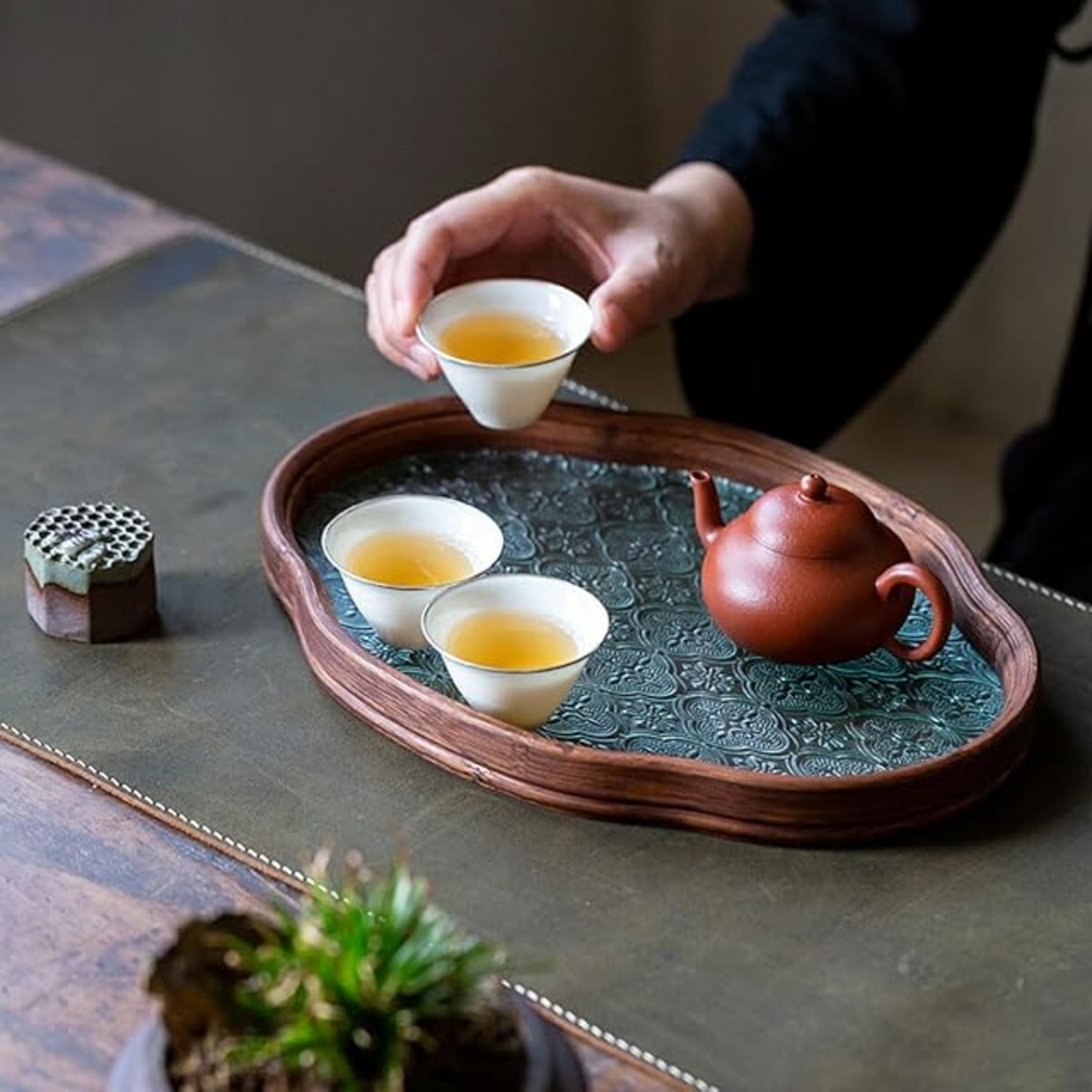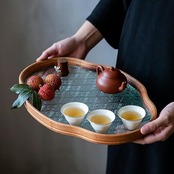 IwaiLoft「シノワズリ・レトロ」フローラガラス トレー トレイ 盛器 雲型 楕円 花柄 29cm 35cm 透明 お皿 ガラス プレート 木 カフェトレイ ティートレー カフェプレート おしゃれ 花海棠柄 木枠オリエンタル盆 (雲型, 長さ29cm x 幅20.5cm x 高さ2.5cm)