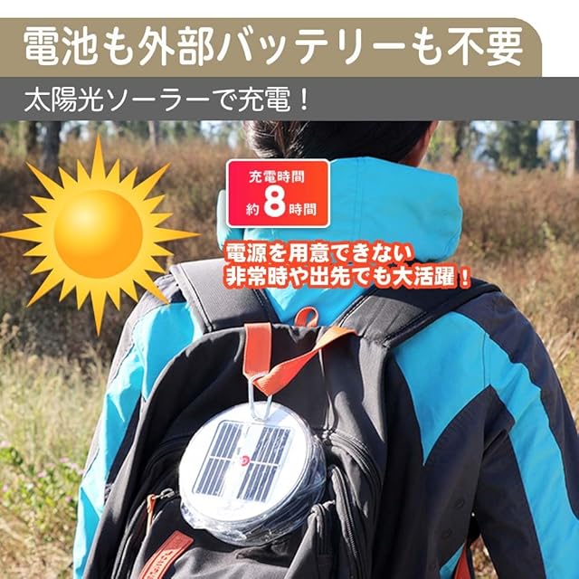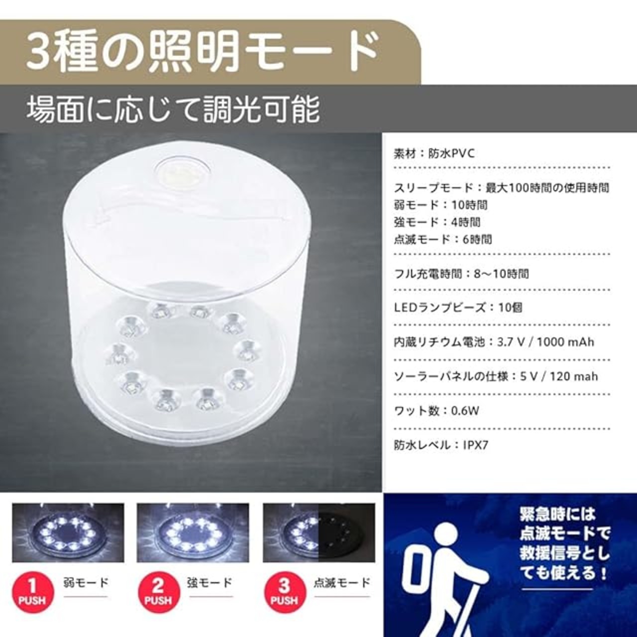停電対策 ランタン サバイバル グッズ キャンプ アウトドア 災害対策 ●防水充電式ソーラーランタン商品仕様 素材防水PVC 防水レベル:IPX7 サイズ・重さ:106g ・膨らんだ時のサイズ:長さ10.8×12.7×12.7cm 仕様スリープモード:最大100時間の使用時間 弱モード:10時間 強モード:4時間 点滅モード:6時間 フル充電時間:8~10時間 LEDランタンビーズ:10個 内蔵リチウム電池:3.7V / 1,000 mAh ソーラーパネルの仕様:5V / 120 mah ワット数:0.6W ●ご注意 ソーラー充電を行う場合、太陽光が直射できる屋外に置いてください。 ソーラーLEDエアーランタン 昼光色 強、中、弱、点滅4種類モード 防水 折り畳み式 太陽光充電 ソーラーライト 省エネ、キャンプライト、台風グッズ ソーラー充電ライト ledライト軽量 ソーラーランタン 停電対策 ランタン サバイバル グッズ