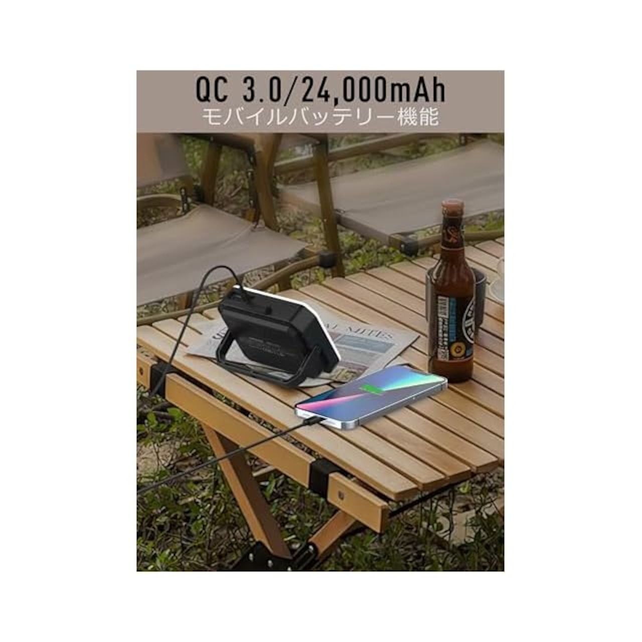 スマホも高速充電 & 超長持ち照明: 24,000mAhの大容量バッテリー に QC3.0搭載 で最大 22.5W出力。アウトドアや緊急時にスマートフォンの 急速充電 が可能。照明は 最大1800ルーメン から 最小20ルーメン まで調光でき、最長 300時間 の連続点灯を実現。