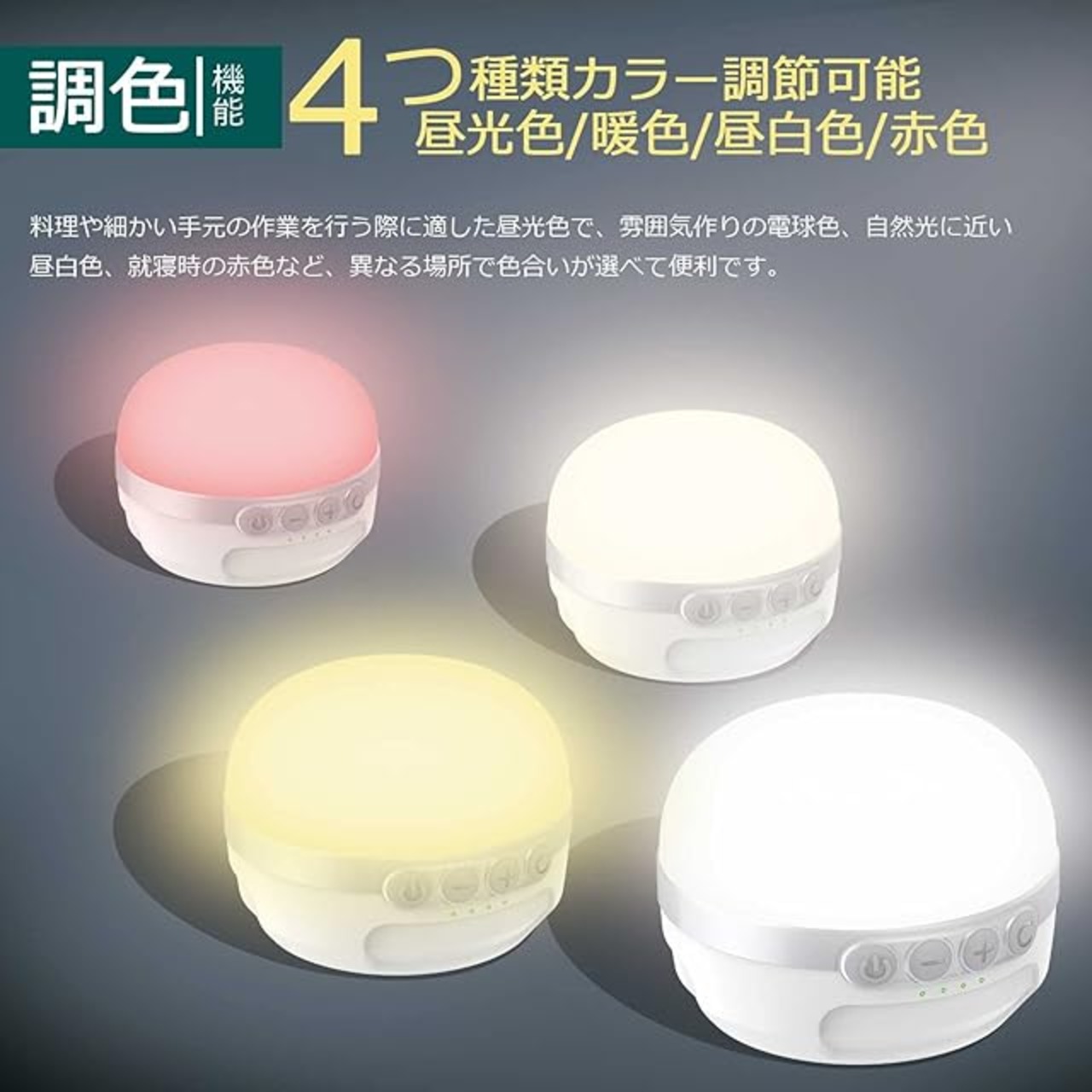 【四色調色/無段階/10段階調光】:ランタン本体の電源ボタンを押して、昼光色/暖色/昼白色/赤色を四つ色切り替わります。+/-ボタンを長押し/短押しして、四つ色が各々に明るさをコントロールし、使用の状況により調節します。