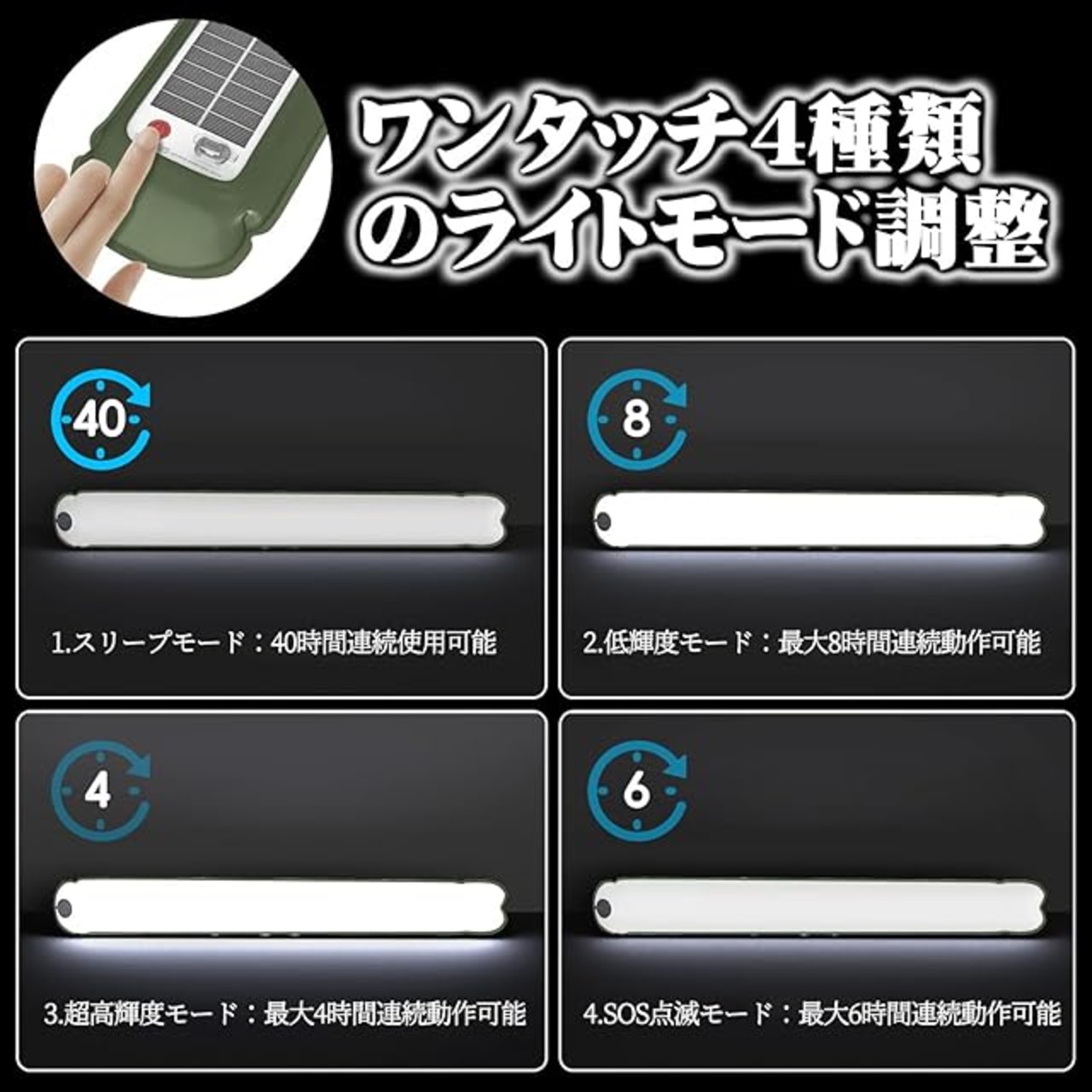 【4つ点灯モード・緊急SOS 】:1. スリープモード、40 時間連続稼働し、安らかな眠りをサポートします。 2. 低照度モード、最大 8 時間の連続作業、一般照明のニーズを満たす 3.高輝度モード、最大4時間の連続作業、屋外の高輝度照明のニーズを満たす 4. SOS 点滅モード、最大 6 時間の連続作業、アウトドアライフを護衛します (現場での緊急事態に特化) アウトドアの達人のための本格的なツールライトです!
