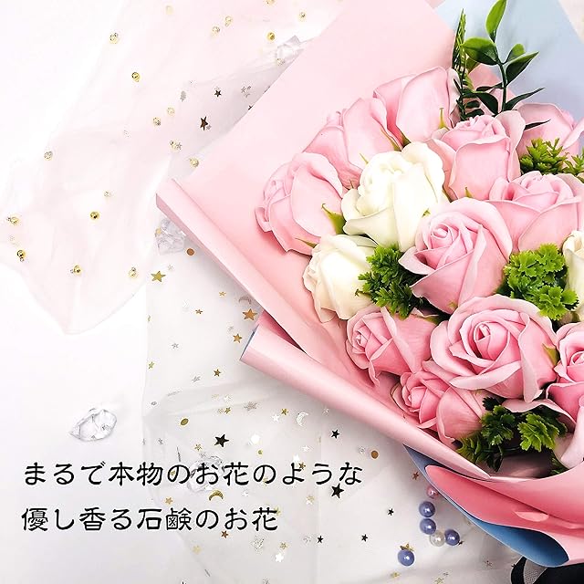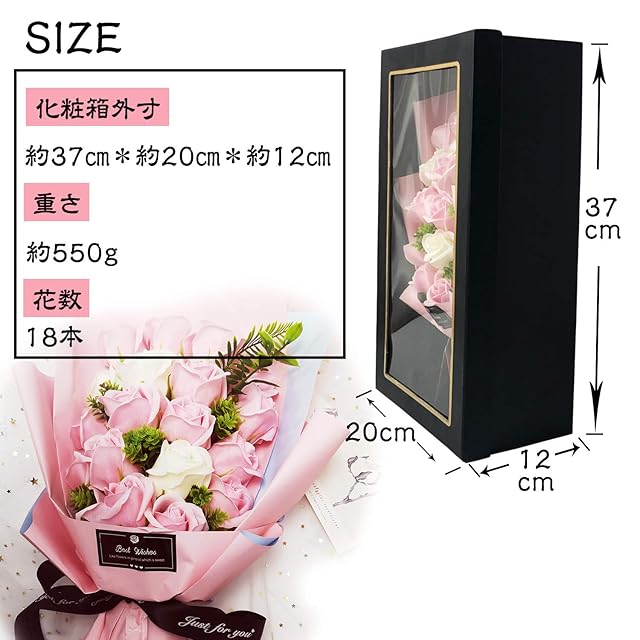 ✿【仕様・パッケージ内容】ギフトボックスサイズ:長さ37㎝*幅20㎝*高さ12㎝;材質:石鹸 ;花色:ピンク+ホワイト 花数:18 パッケージ内容*1:黒リボンの花束+黒色の窓付きギフトボックス*1+メッセージカード*1
