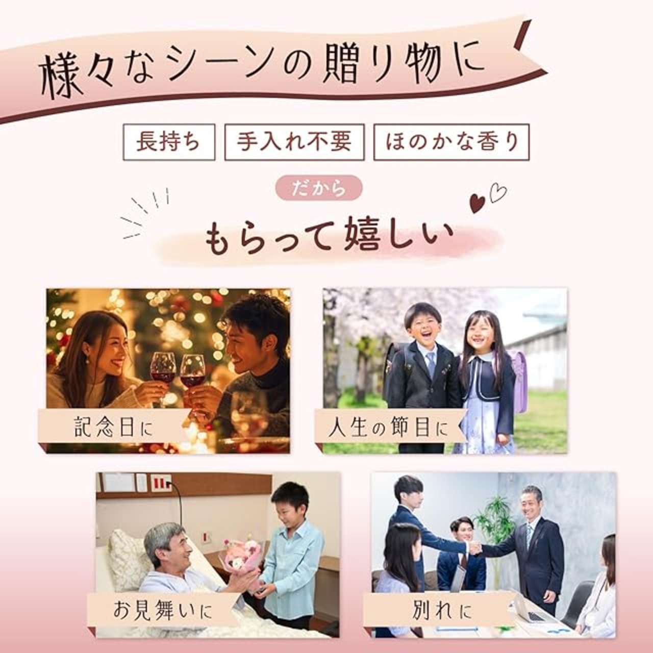 フレグランスソープフラワーは石鹸の素材から作られたほのかな香り付き観賞用のお花です。 生花で問題視されているアレルギーの原因となる花粉やにおいの発生、細菌の繁殖がありません。 水やり・水換えなどの世話をする手間がいりません。 当店は日本の販売業社ですので安心してご利用くださいませ。