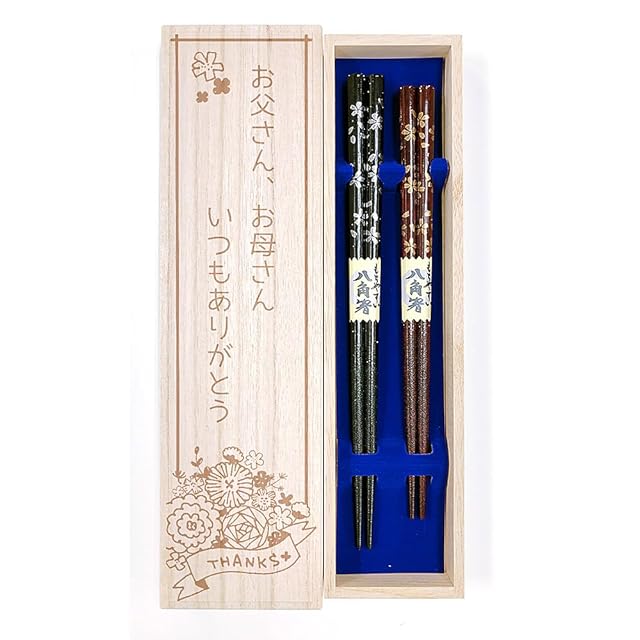 桜が散りばめられたデザインのお箸。八角形、食洗機対応です。箸先には滑り止めもついています。「お父さんお母さんいつもありがとう」と彫刻したデザイン桐箱に入れてのお届けです。ラッピング済みですぐにお渡しも出来ます。◆◆◆ラッピングは予告なく変更となる場合がございます◆◆◆