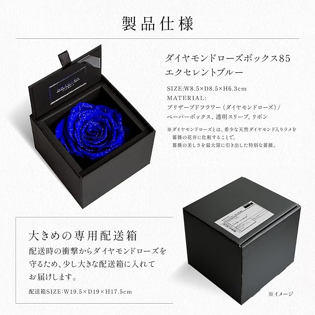商品名:AMOROSA アモローサ プリザーブドフラワー ダイヤモンドローズボックス85 エクセレントブルー バラ ギフト 花 誕生日 結婚 記念日 プロポーズ ドライフラワー AM85FS-61
