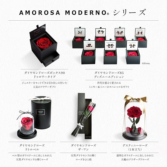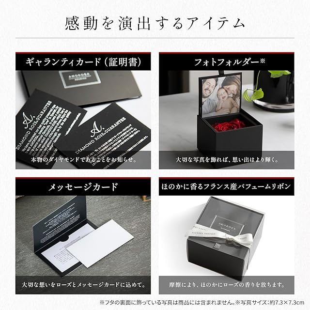 【天然ダイヤモンドとバラ 】 2つの憧れとトキメキが詰まった小箱を開けた瞬間、誰もが驚き幸せな気分に包まれます。 【プリザーブドローズの女王】 堂々と咲き誇る姿から「プリザーブドローズの女王」とも呼ばれる高級プリザーブドローズ。 【ダイヤモンドローズ】 バラの花びらに散りばめられた希少な天然ダイヤモンド入りラメは、光を四方に分散させながら輝くため、上品で本物の煌めきが生まれます。※ダイヤモンドローズは株式会社アペルの登録商標です。 【累計30万の人々を笑顔に】 2輪のバラをスマートに贈るギフトスタイルが、幅広い世代から支持されています。 【毎日を“嬉しい”に】 フタの裏面には写真が飾れます。大切な写真を飾れば、思い出はより輝き、見るたびに嬉しい気分に。 【ギャランティカード】 ダイヤモンドローズの正規品であることを証明するギャランティカード(証明書)をお付けしています。 【メッセージカード】 白無地のカードをお付けします。言葉にできない様々な想いを、花とメッセージカードに込めて。 【香りの演出】摩擦によりほのかに香る、フランス・パリ製の高級ローズパフュームリボンで包装。 【お取扱い説明書】 プリザーブドフラワーをご存知ない方へも安心してお贈りいただけます。 【プリザーブドフラワーについて】 プリザーブドフラワーとは自然のバラの花に特殊保存加工を施し、水なしで鮮やかな色とみずみずしさ、美しさを数年にわたり保てるようにした特殊なバラのこと。 【知っておいていただきたいこと】 ※プリザーブドフラワーは大変デリケートな素材のため配送途中の衝撃によって多少ひび割れが生じる事があります。あらかじめご理解ください。 ※生花を加工した商品のため、ひとつひとつ色形大きさが異なります。 ※食用ではありません。 ※水やりは必要ありません。 ※直接手でふれると花びらが破れる場合があります。 ※湿気に弱く、湿度の高い場所に置くと、花びらが透けることがあります。 ※加湿器の横や浴室など湿度が高い場所でのご使用はカビや害虫が発生するおそれがあります。 ※エアコンなどの風が直接あたらないようにしてください。 ※直射日光やスポットライトのような強い光があたる場所は色あせなどの原因となります。 ※家具や壁紙、カーテンや洋服等に付着すると色素が色移りする場合があります。 ※プリザーブドフラワーに含まれる保湿液は油となじむ性質があるため、油性の材質と接することで花が貼りついたり、色染みなどの原因となります。家具の油性塗料やニス、仏壇の漆などに直接触れないようにして下さい。 ※可燃性のため、暖炉や、仏壇のローソクや線香の近くなど、火気厳禁です。