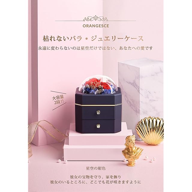 商品名:ORANGESCE 大容量 プリザーブドフラワー ジュエリーボックス 枯れない花 女性 女友達 彼女 母 完璧な贈り物 として 大切な人へ感謝の気持ちを伝える バレンタイン 記念日 誕生日 人気 結婚祝い 引越し祝い 母の日 プレゼント クリスマス 入学 卒業 メッセージカード付き ギフトブリザードフラワー(星空の紺色)