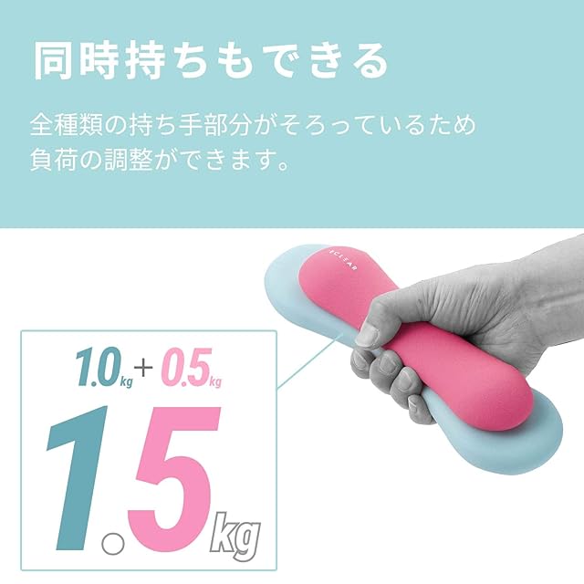同じ重さでも異なる重さでも、2個を重ね持ちでき、重さの調節が可能です。※本製品は1個入りです。