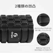 【程よい2種類の凸凹】表面に指のようなチューブ形状、手の平のような平らな形状、指先のように突起形状で、人間工学に基づいたフォームローラーです。指先のような小さな凸凹でコリをほぐし、平らな面では手のひらで押すような優しい感じを与えます。ローラーの上でバランスを取りながらストレッチ、バランストレーニングにも適します。
