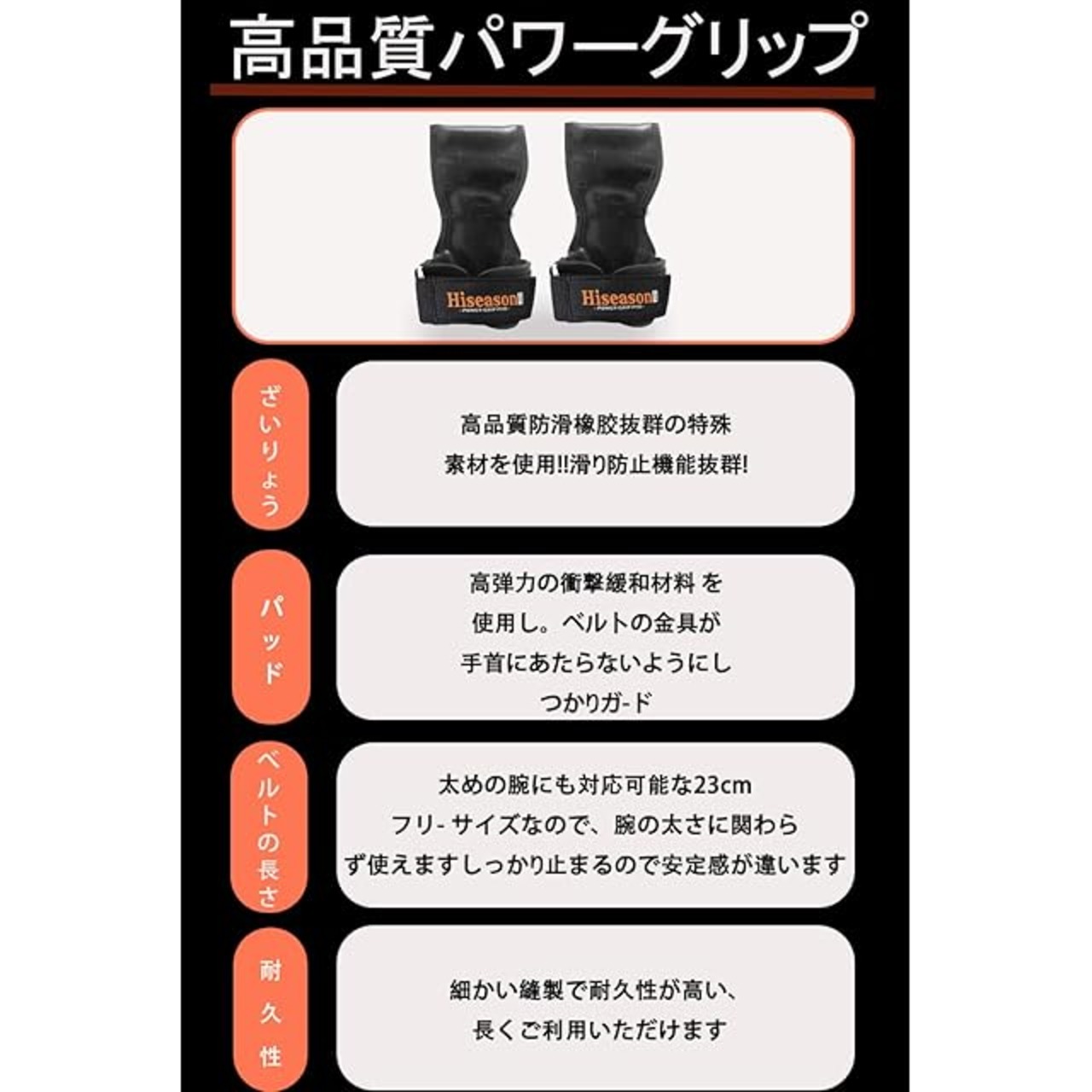 商品名:Hiseason パワーグリップ 筋トレ 懸垂 ラバー 握力補助 滑り止め改良強化 耐摩耗 ぱわーぐりっぷ 強度600kg 男女兼用 左右セット 黒