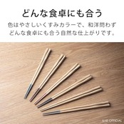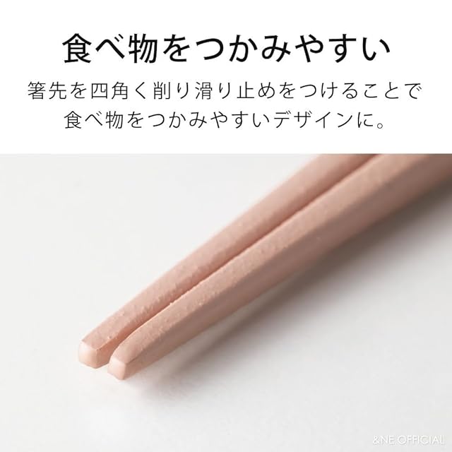 ゆるやかな曲線が手になじみ、箸先は四角く削り滑り止めをつけることで食べ物をつかみやすいデザインに。