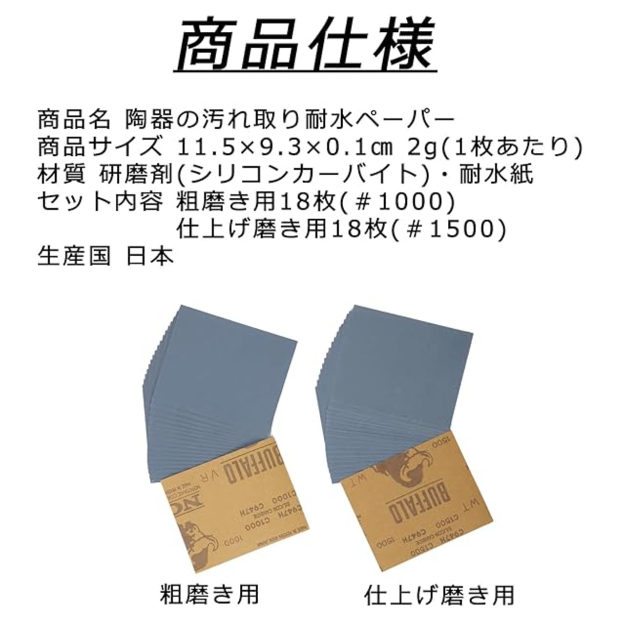 【サイズ】11.5×9.3×0.1cm【内容量】36枚入り(粗磨き用/仕上げ用 各18枚)【材質】研磨剤(シリコンカーバイト)、耐水紙【生産国】日本