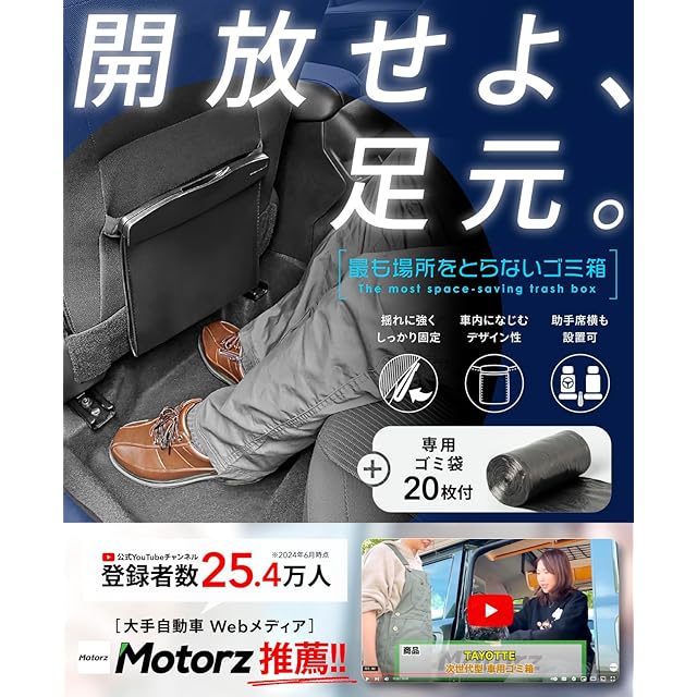【足元スッキリ開放】従来品はシートを倒すといつもブラブラして邪魔になっていました。自社ゴミ箱は下部にある2本のマジックテープでピッタリ座席にフィットします。最大限に車内スペースを広くし、快適なドライブへ。