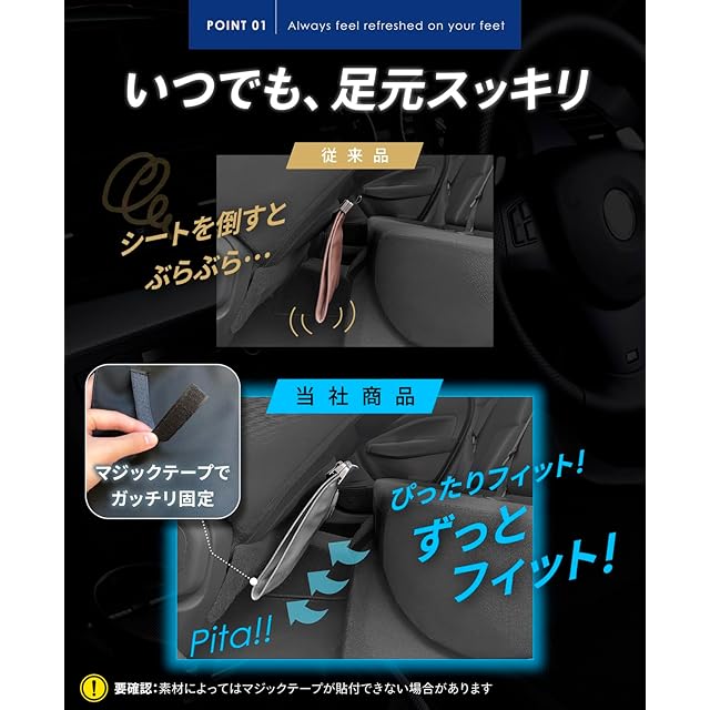 【揺れなんか気にしない】座席後部ポケットに差し込むフックとシート下部に張り付けるマジックテープで座席にW固定します。多少の揺れや人の蹴りには動じません。前の人が座席を倒してもブラブラせず、足元スペースをしっかりと確保します。