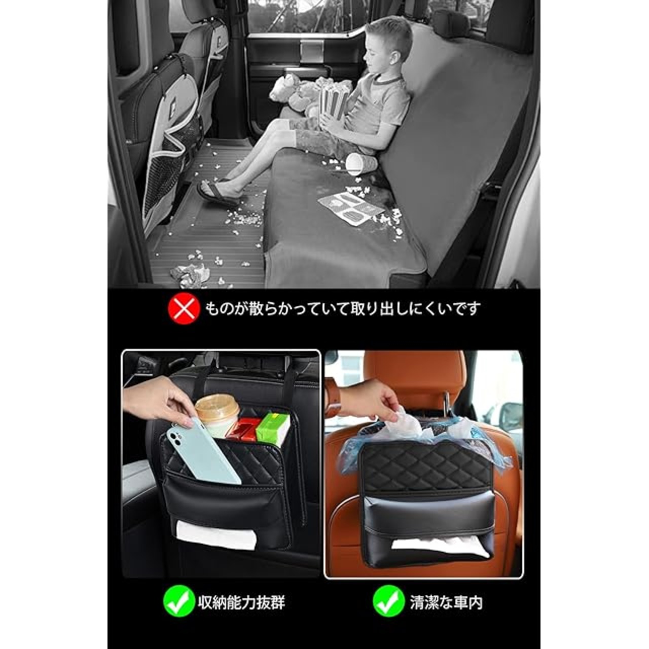 【車内スペースを節約】車の座席の背面に掛けられる収納バッグと、車用ティッシュボックス兼ゴミ箱として使えるデザインです。ティッシュ、保温カップ、傘、IDカード、携帯電話、メガネ、その他の小物を収納可能です。