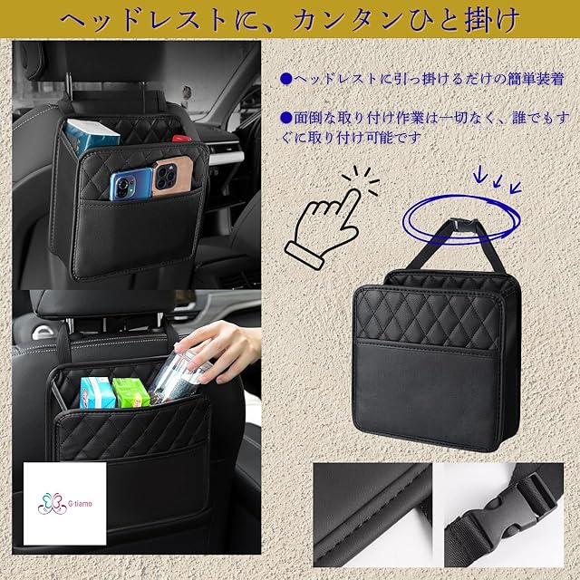 商品名:[ジーティアモ] 車用 収納 ケース ポケット バッグ 吊り下げ 取り付け 簡単 グッズ 黒 カー用品 マチあり ゴミ箱 整理 (ブラック)