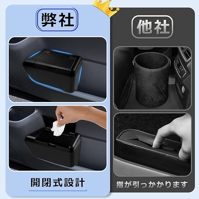 3.【多機能用途&開閉式設計】:車内のゴミ箱や室内収納ボックスとして使用できます。本製品の蓋は開閉式のゴミ箱となっておりますので、中に入れたゴミが外から見えることがなく、スマートにゴミを管理することができるといえます。ゴミや異味がきちんとロックできます。また着脱式デザインによって、ドアゴミ箱のフタを開けるだけでゴミを片付けができます。