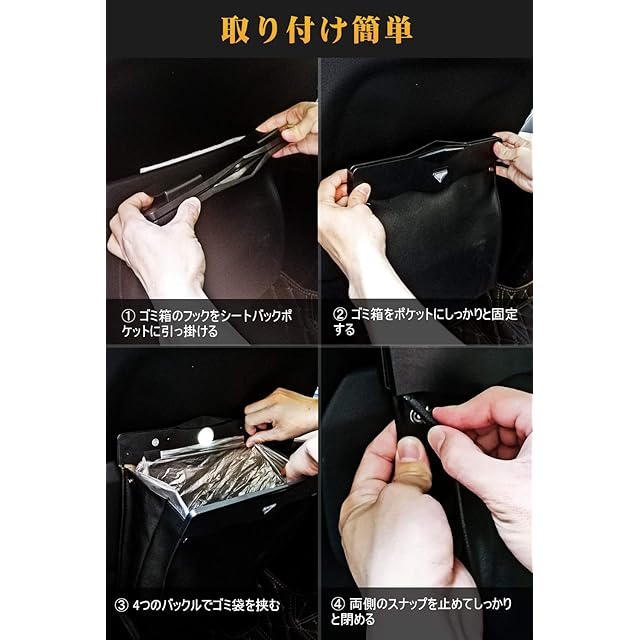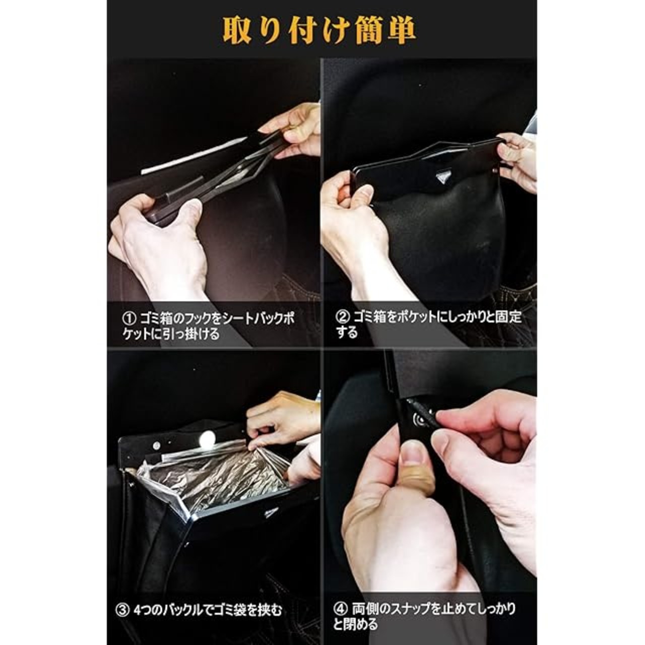 【倒れない&省スペース】この車用ゴミ箱は、後ろ部分にフックがついており、運転席や助手席のシートバックポケットに引っかけることで、ちょうどよくゴミを捨てることができます。また、折りたたみ式で車内スペースを取らず、後部座席の人の足元を妨げることもありません。後席の出入りもスムーズに行えます。通常の置き型の車用ゴミ箱やダストボックスとは異なり、この車用ゴミ箱は倒れたりして散乱する心配がありません。車内の整理整頓に大変役立ちます。