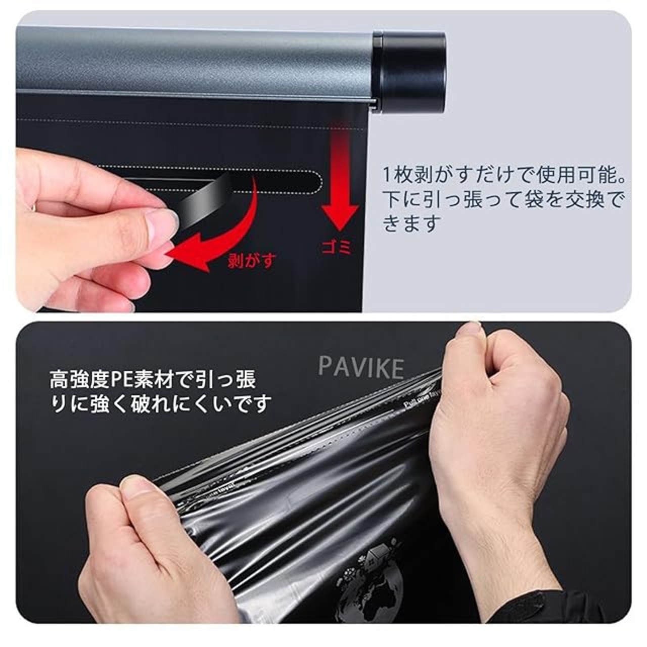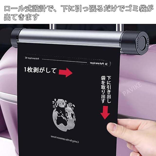商品名:PAVIKE 車 ゴミ箱 吊り下げ 車用ゴミ袋オーガナイザー 車 収納ポケット車のゴミ箱 回転設計 コンパクト省スペース 2ロールゴミ袋付き(本体1巻、予備1巻付き) 車用 ブラック