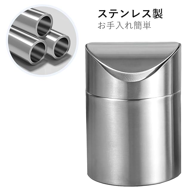 【ステンレス】ステンレス製で、錆びやカビが発生しにくく、濡れやすい場所に置いても清潔さをキープできます。生ゴミを入れたり油汚れがついたりしても、簡単にお手入れができます。なかでも丸洗いに対応したものは、よりえいせい的に使い続けられます。<br/><br/>【スイング式】フタがゆらゆら動くスイングタイプは、ワンプッシュ式と比べてフタを閉める手間がかからず、片手でゴミを捨てたいときに便利です。ゴミを持った手で押すだけで隙間ができるので、扱いがスムーズ、ゴミの脱落や悪臭を防ぐことができます。<br/><br/>【デザイン】フタは取り外し可能なので、ゴミの入れ替え内部のお手入れも簡単です。すっきりしたシンプルデザイン、リビングやワークスペースなど、必要に応じてさまざまな場所へ移動させながら使えます。小さいなので、デスクに置いてもなじみやすいです。<br/><br/>【コンパクト】直径12cm、高さ16.5cm、容量1.5L、小型で場所を取らません。コンパクトな円柱型なので、カップホルダーや車のドアポケットなどに収納可能です。ゴミ箱としてはもちろん、小銭やカギ・ペン類などの紛失を防ぐ小物入れとしても使えます。