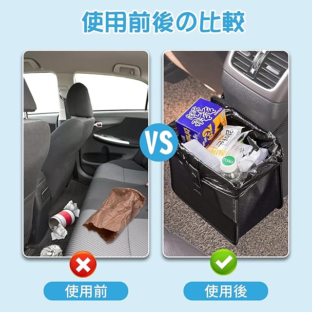 【大容量・省スペース】大容量なので散らかりがちな車内もスッキリ片付きます。足元に置くタイプのゴミ箱よりスペースを有効に活用できます。