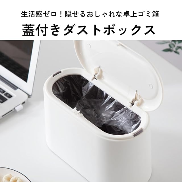 【生活感ゼロ!隠せるおしゃれな卓上ゴミ箱】22×11×14.5cmの省スペース設計で、机や洗面所、トイレなどに最適なミニゴミ箱。フタ付き&カバー構造でゴミ袋を見せず、インテリアに自然と馴染みます。ワンプッシュ開閉、留め具付きで片手で持ち運び可能。おしゃれと機能性を両立し、清潔感を保ちながらデスク周りをすっきり整えます。