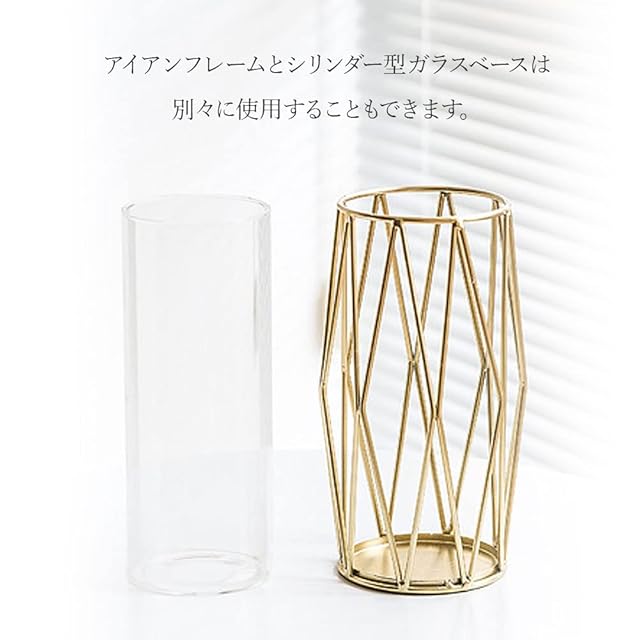 異素材の組み合わせの新しいフラワーベース。北欧風のシンプルデザインですので、部屋のどこに置いてもすんなりと馴染みます。菱形のメッキ仕上げの鉄フレーム×ガラスの異素材の組み合わせがおしゃれ。ガラスの容器と鉄のフレームを分離することができ、ガラスの容器を取り出すと、植物に水を換えることが簡単です。生け花やドライフラワーなどを飾ればお部屋が華やかになります。