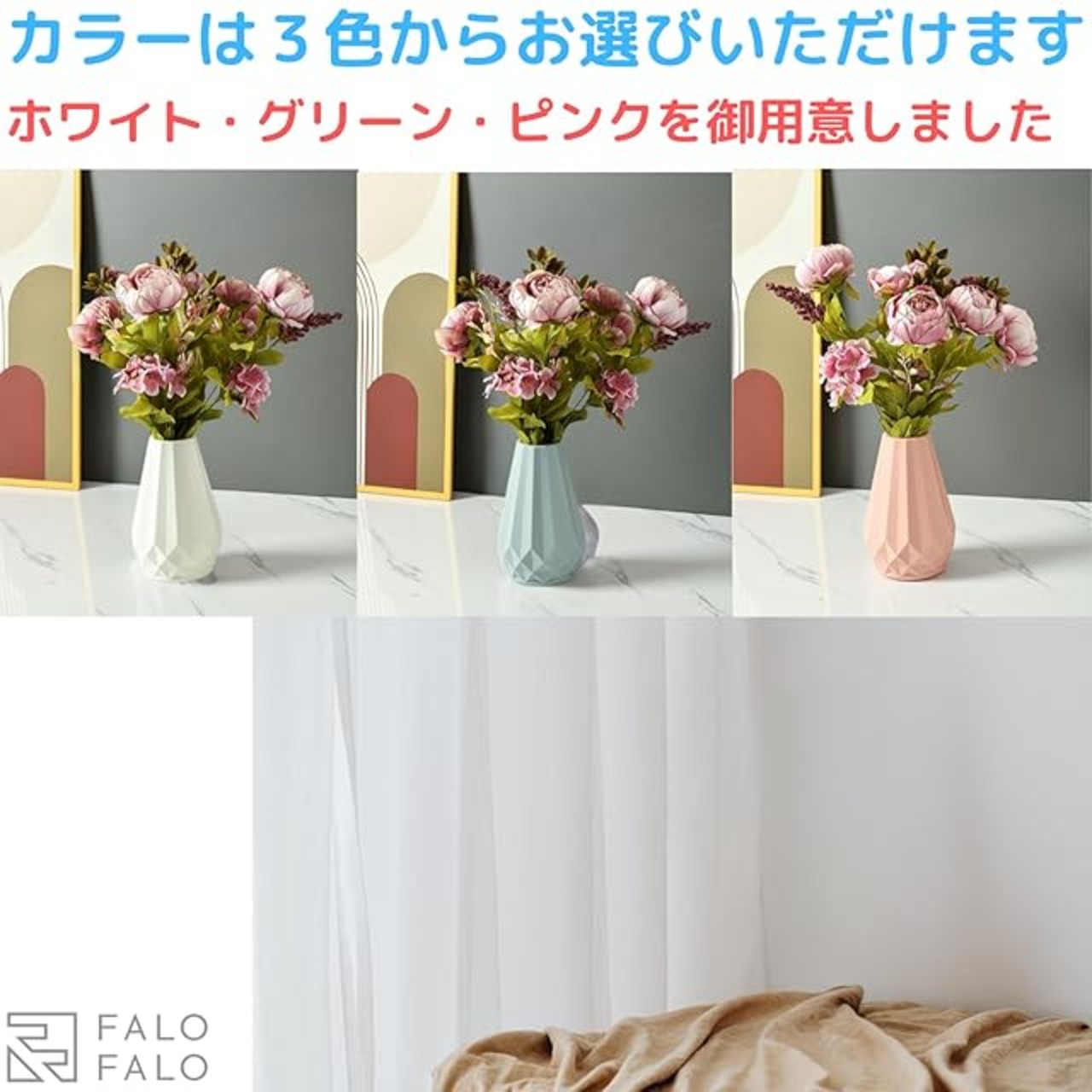 【割れにくく軽量】プラスチック製の花瓶、フラワーベースです。陶器製と比べ、割れにくく軽量です。小さなお子様のいらっしゃるご家庭でも安心してお使いいただけます。【北欧風のシンプルなデザイン】温かみのある、やさしいシンプルな北欧風デザインです。さまざまなお部屋の雰囲気にマッチするデザインでお花を楽しんでいただけます。【3色のカラーからお選びいただけます】優しい色合いのホワイト・グリーン・ピンクの3色を御用意いたしました。お好きなお色からお選びください。