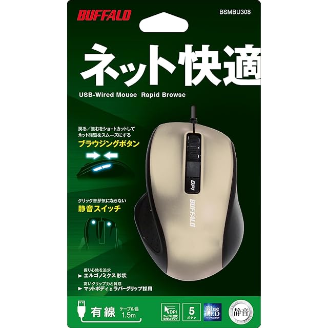 商品名:バッファロー BUFFALO 有線 BlueLED 静音 5ボタンマウス ゴールド BSMBU308GD