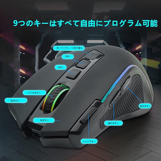 商品名:e元素2.4Gワイヤレスゲーミングマウス RGBバックライト付き 9つプログラム可能なボタン マクロ記録サイドボタン付き DPI調整可能 無線と有線の両対応マウス プロゲーマー用マウス