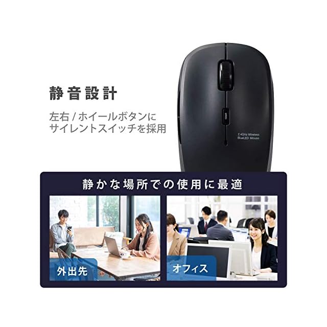 マウスのクリック時のカチカチ音がしない静音スイッチを採用し、カフェや図書館など音が気になる場所でも使えます。