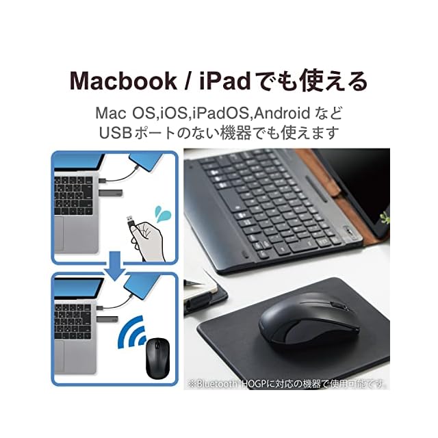 Bluetooth(R)HOGPに対応したパソコンなどの端末で、USBポートをふさがずに接続できます。レシーバが不要なため、USBポートが少ない薄型パソコンやタブレットをスマートに使いこなせます。※1