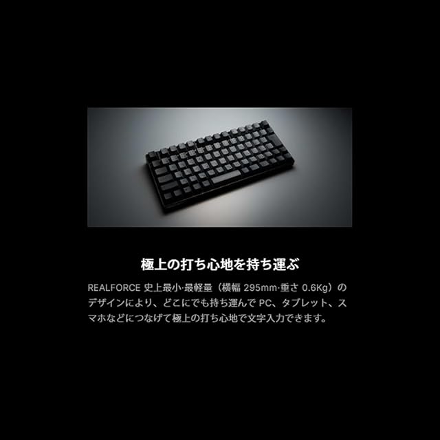 Realforce 史上最小·最軽量(横幅 295mm·重さ 0.6Kg)のデザインにより、どこにでも持ち運んで PC、タブレット、スマホなどにつなげて極上の打ち心地で文字入力できます。