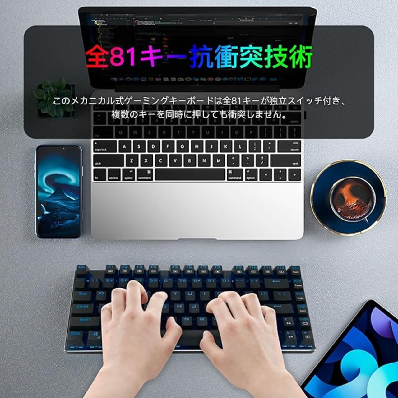 【81キーロールオーバー・コンパクトなサイズ】▶全81キー無衝突。各キーが独立キースイッチを採用し、1つのキーに対して1つの機械式スイッチと金属製のバネ(スプリング)を組み込む特殊な構造です。81キーを同時に押せても干渉されず、意図通りに入力できます。仮に1つのキースイッチが壊れても交換すれば使い続けられ、キーボードを開いてPCBボードを取り外せ必要はありません。メンブレン式キーボードに比べ、耐久性に優れ、打ち心地が絶品と評判が高いです。キーの感触にこだわりのあるユーザーや着実なキー入力が求められるヘビーゲーマーに最高。テンキーレスの81キー小型モデル、サイズが幅310mmでマウスの動作を邪魔になれず、省スペースで使えるのがメリットです。