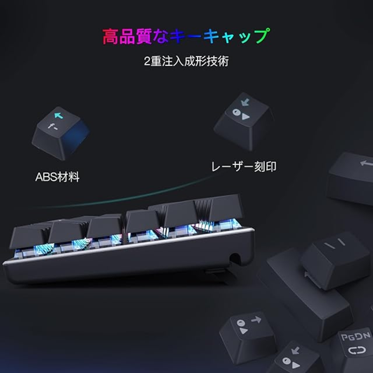 【取り外せ赤軸・DIYで盛り上げ】▶ メカニカルスイッチ中に一番柔らかい。優しけど、リニア軸としての急速な入力による快感は、段落感の青や茶では味わえません。そして、黒軸をベースとし、音は小さくて、より一層軽く滑らかになっている、「行雲流水」のような打鍵感とも言える。タイプ音は「かちゃかちゃ」と柔らかい音で聞こえはするものの作業の邪魔になる音量ではない。キーが反応しない場合、このキーボードの軸が取り替え、用途によって「押し下げ圧力・打鍵感・クリック音」などが自由に選べ、異なる軸を部分的に使用しよう場合は自分で交換するのも簡単です。▶ギフト:スペア赤軸*5・キーキャッププーラー*1・スイッチプーラー*1。