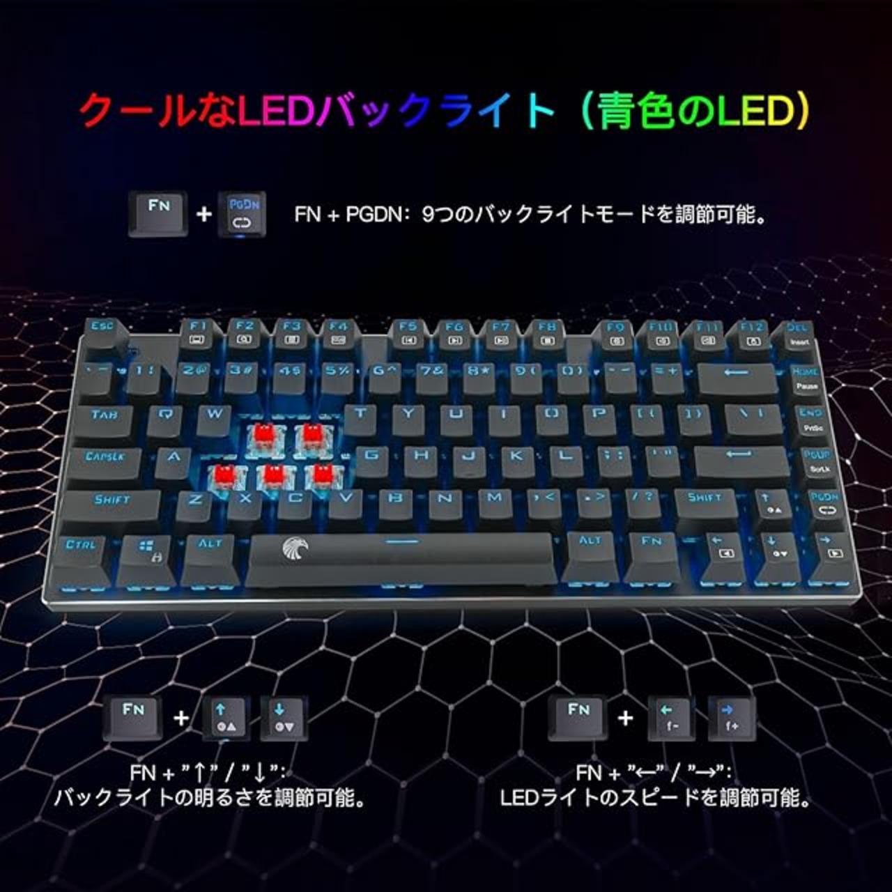商品名:e元素ゲーミングキーボード 赤軸・青軸メカニカル式キーボード USB接続有線81キーアンチゴーストキー 青色LEDバックライト 防水機能付きゲーマー向け英語配列キーボード (赤軸・ブラック)