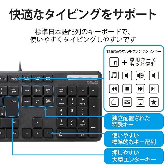 商品名:エレコム(ELECOM) 有線キーボード TK-FCM108KBK 薄型 メンブレン式 抗菌 フルサイズ テンキー付 ブラック